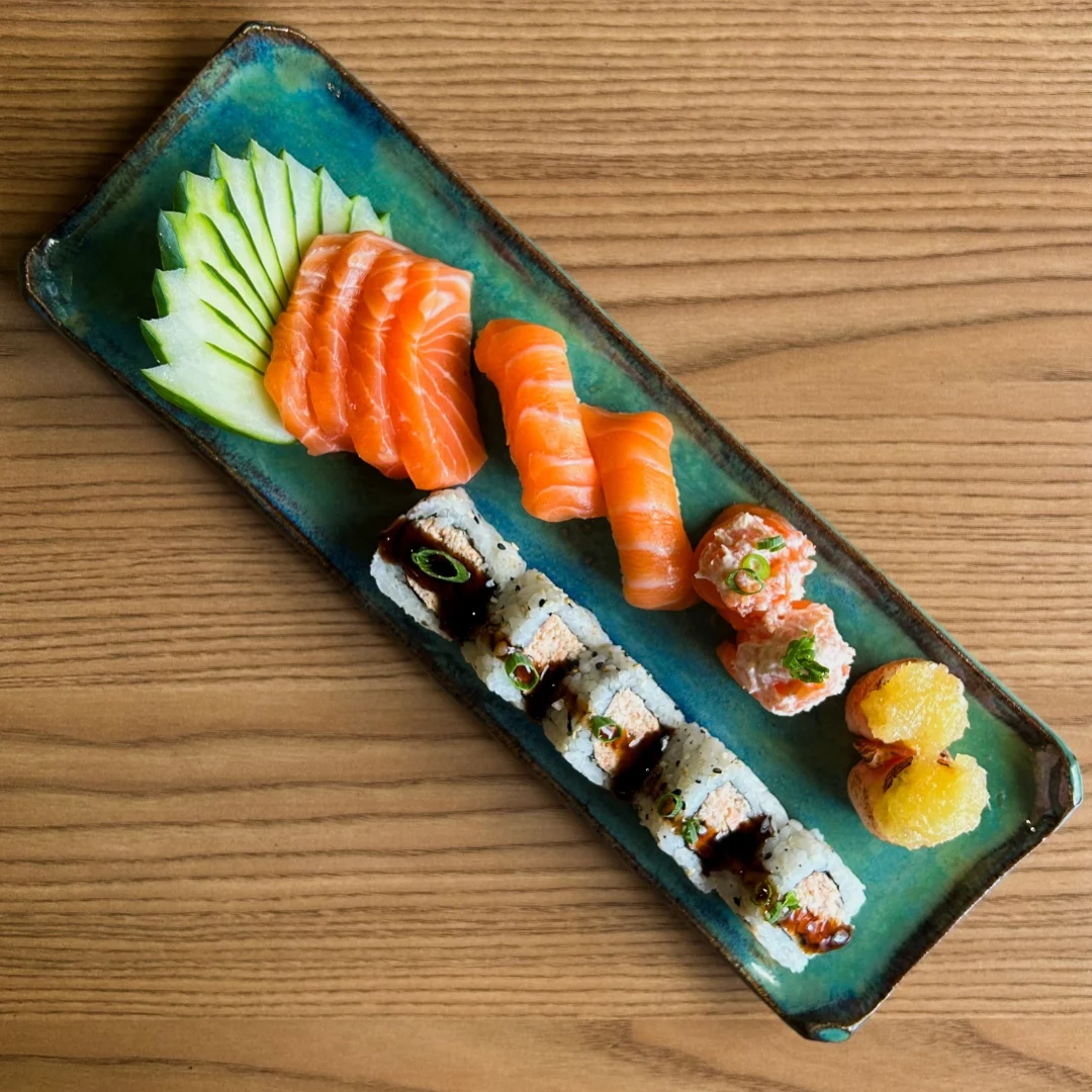 5 uramakis patê, 4 sashimis de salmão, 2 niguiris de salmão, 2 joes de salmão e 2 joe de abacaxi para uma experiência completa.