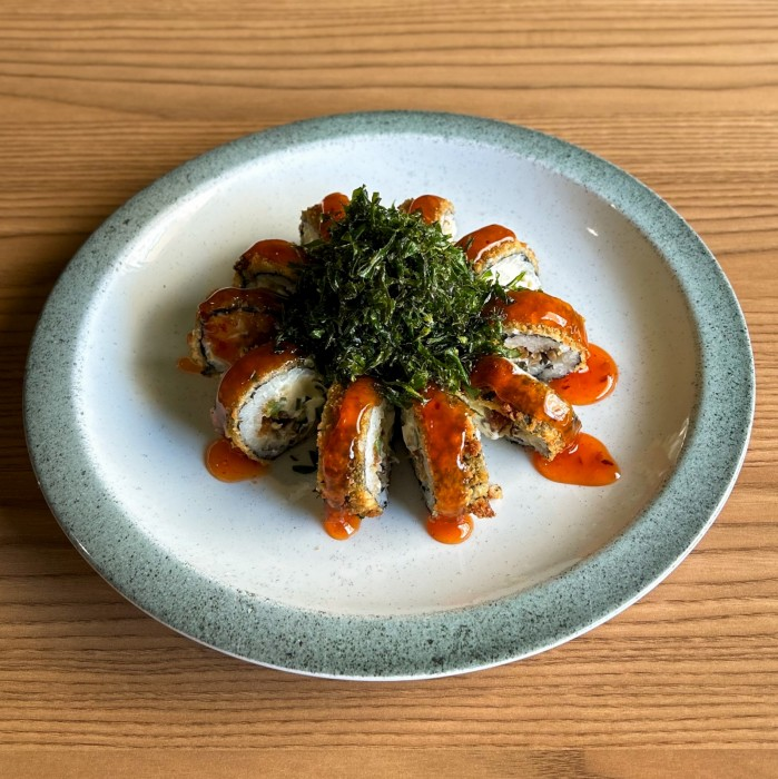 Recheado de aspargo empanado e frito, shimeji e cream cheese, finalizado com sweet chile e crispy de