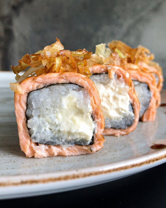 Hot envolto por fatias de salmão com cream cheese. Para tornar ainda mais incrível, é maçaricado, regado com tarê e finalizado com crispy.