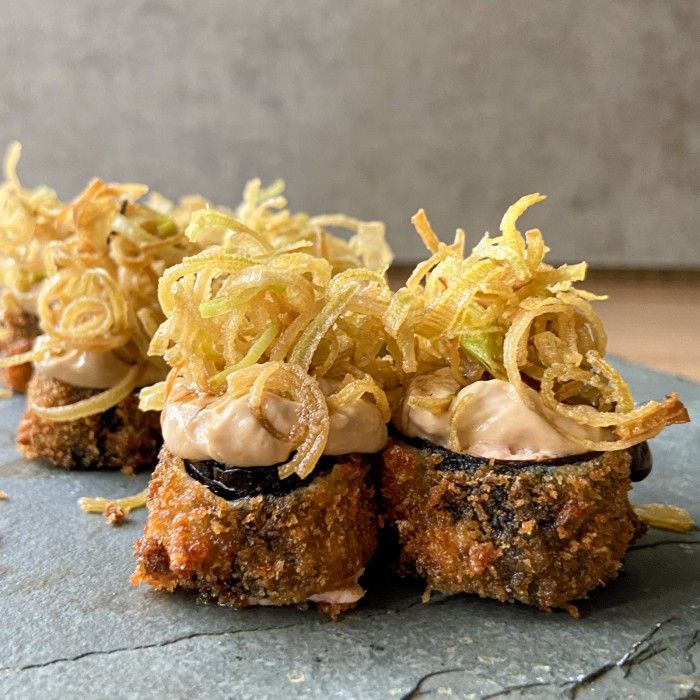 Recheado de kani e patê de salmão grelhado, finalizado com molho cream black e a crocância do crispy de alho poró.