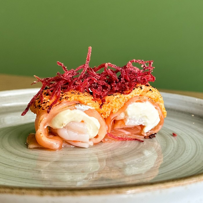 Recheado de camarão cozido, cream chesse envolto por lamina de salmão, finalizado com tamago trufado, e crispy de beterraba