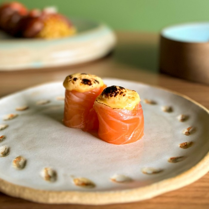 Joe de salmão finalizado com creme de tamago maçaricado.