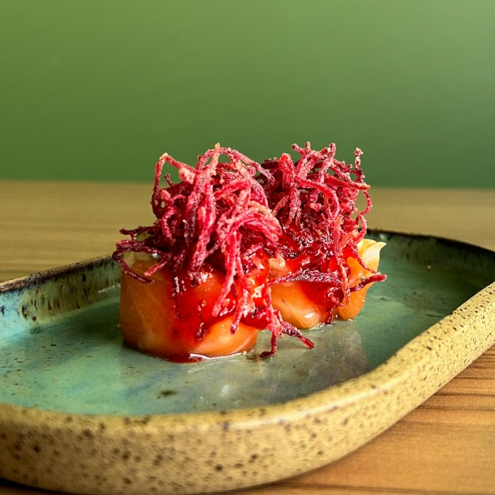 Joe de salmão, coberto com gorgonzola e finalizado com geleia de morango e crispy de beterraba.
