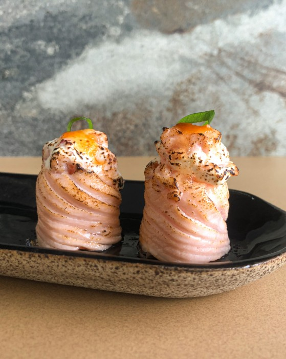 Camarão empanado, envolto por salmão maçaricado com cream cheese e finalizado com uma crocância irresistível de crispy.
