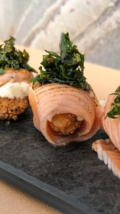 Camarão empanado, envolto por salmão maçaricado com cream cheese e finalizado com uma crocância irresistível de crispy.