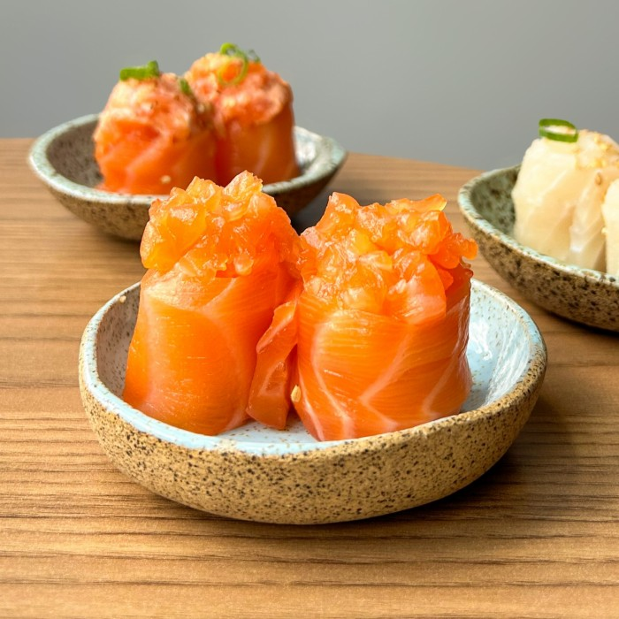Arroz, enrolado por lâmina salmão e finalizado com patê de salmão e cream cheese, gergelim e cebolinha.