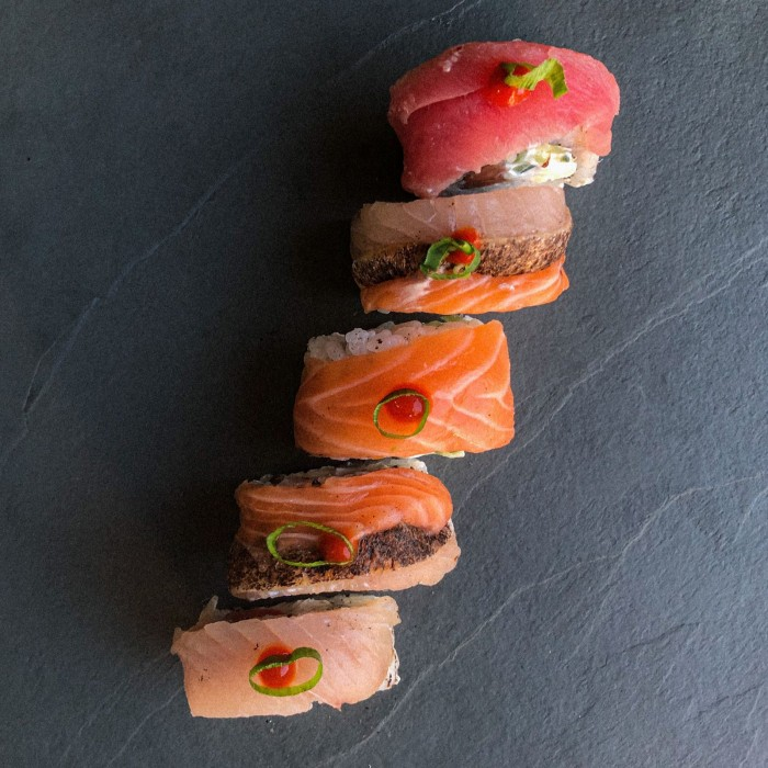 Recheado de salmão, cream cheese, coberto por lâminas de salmão e finalizado com molho de shimeji e farofa de haru.