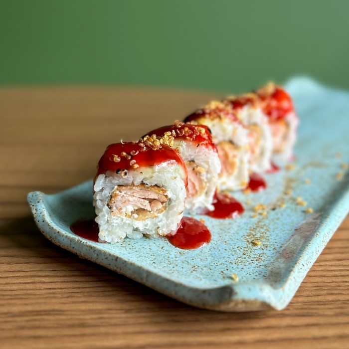 Recheado com salmão empanado e frito, cream cheese coberto com lâmina de salmão, queijo gorgonzola maçaricado, finalizado com geleia de morango e crispy de tempurá.