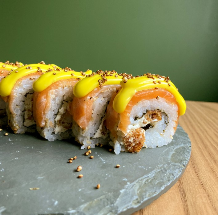 Recheado com salmão empanado e frito, cream cheese coberto com lâmina de salmão, queijo gorgonzola maçaricado, finalizado com geleia de morango e crispy de tempurá.