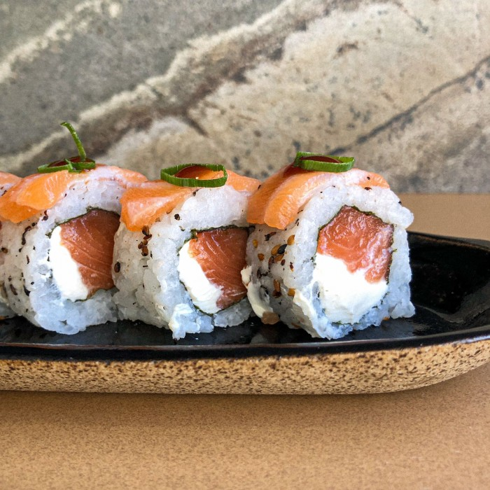 Recheado com salmão e cream cheese, coberto por lâminas frescas de salmão, finalizado com molho e cebolinha.
