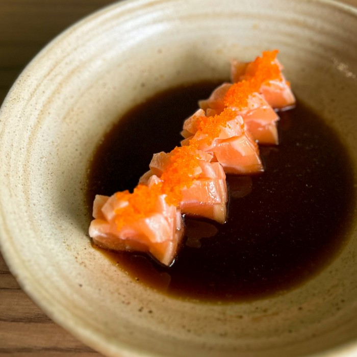6 cubos de salmão, coberto por tamago trufado e maçaricado.