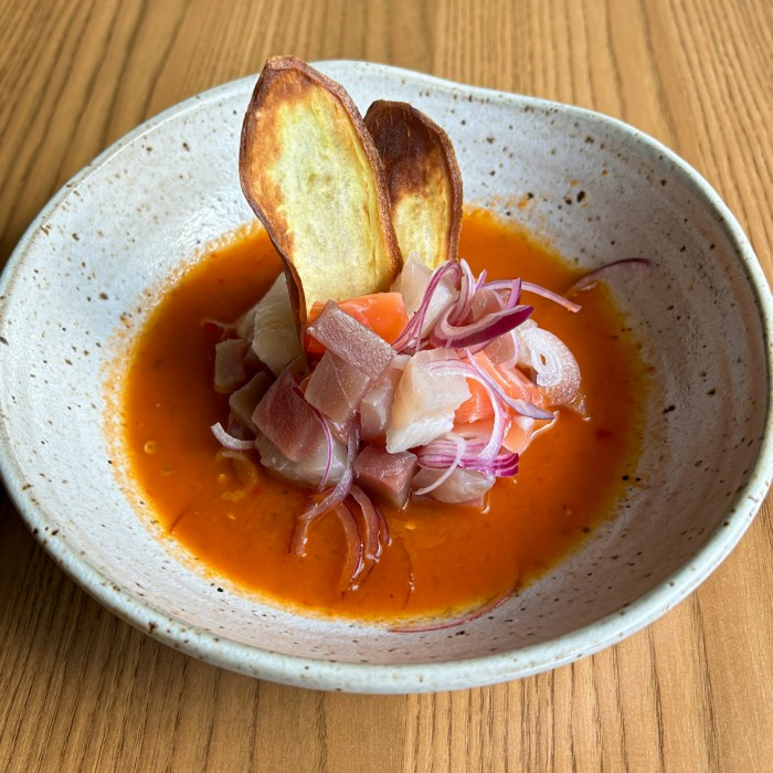 Mix de pescados em cubos, cebola roxa, pimenta dedo-de-moça, coentro, suco de limão e mix de pimentas peruanas. Acompanhado de chips de batata doce. (cítrico e levemente apimentado).
