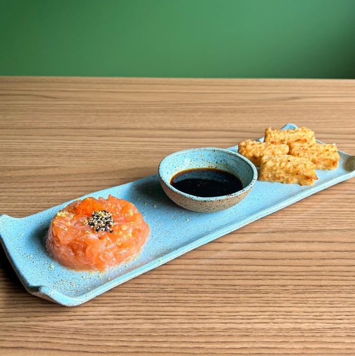 Salmão em cubos, temperado com azeite trufado e raspas de limão siciliano, finalizado com ovas e gergelim torrado. Acompanhado de molho ponzu e shari frito.