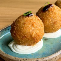 Patê de salmão grelhado com cream cheese, empanado e frito, finalizado com molho tarê e cebolinha.