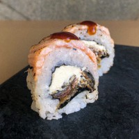 Recheado de salmão, cream cheese, coberto por lâminas de salmão e finalizado com molho de shimeji e farofa de haru.