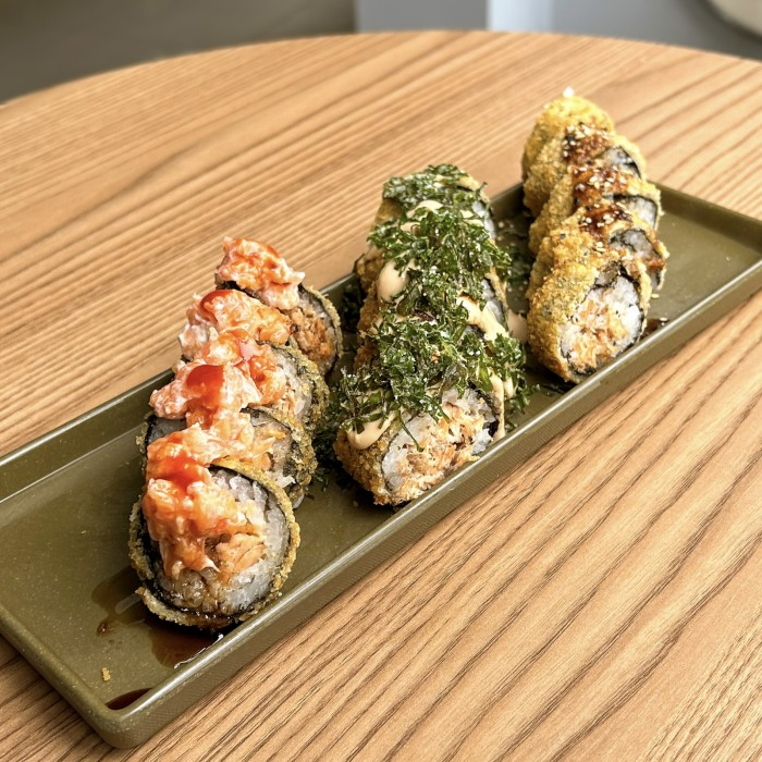Delicioso camarão empanado, envolto em cream cheese e salmão, regado com tarê e cebolinha fresca.