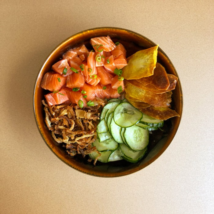 (400g) Com base de arroz shari, coberto com sunomono, crispy de cebola, chips de batata doce e salmão delicadamente regado com um molho cítrico.