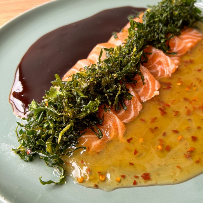 6 lâminas de salmão acompanhado de molho tarê e sweet chilli, finalizado com crispy de couve.